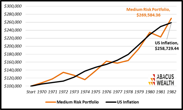 To help us answer this, let’s look at the 1970-1982 period and use data available for the USA. Throughout this period, inflation grew at an average rate of 7.64% per year, oscillating between 3.30% (1971) and 13.30% (1979). This was indeed a very challenging period for savers. In the chart below, we compared how $100,000 growing in accordance with the annual USA inflation rate performed VS an investment in a theoretical medium-risk portfolio (60% stocks, 30% fixed income, 10% commodities). In this exercise, we also included a 1.30% total annual cost ratio on the medium-risk portfolio.
